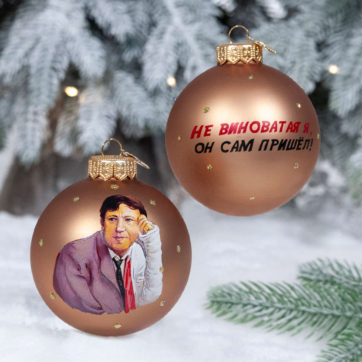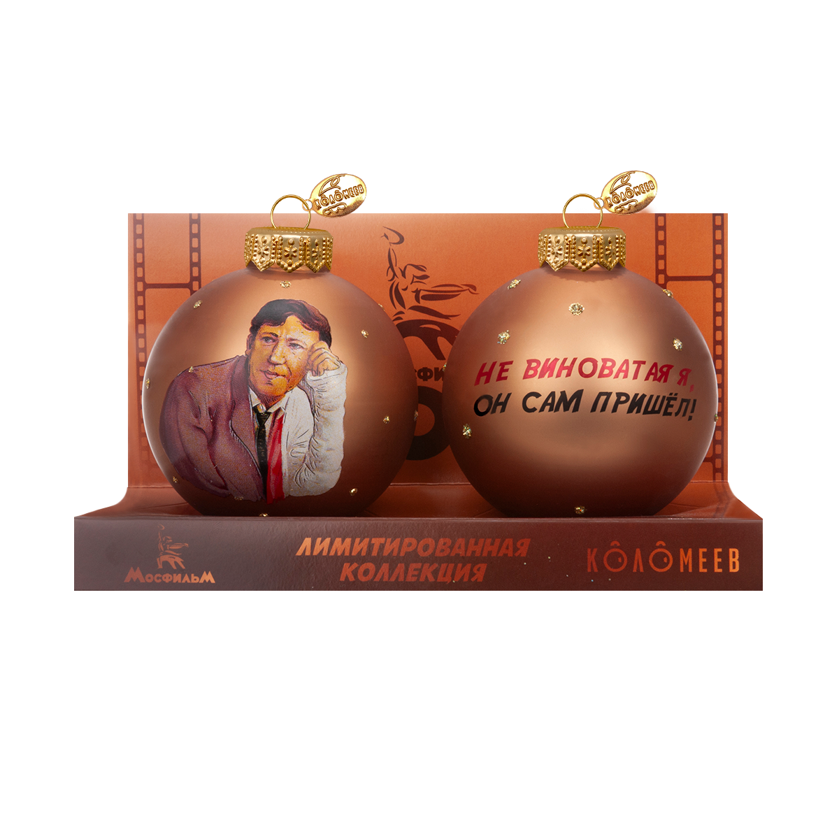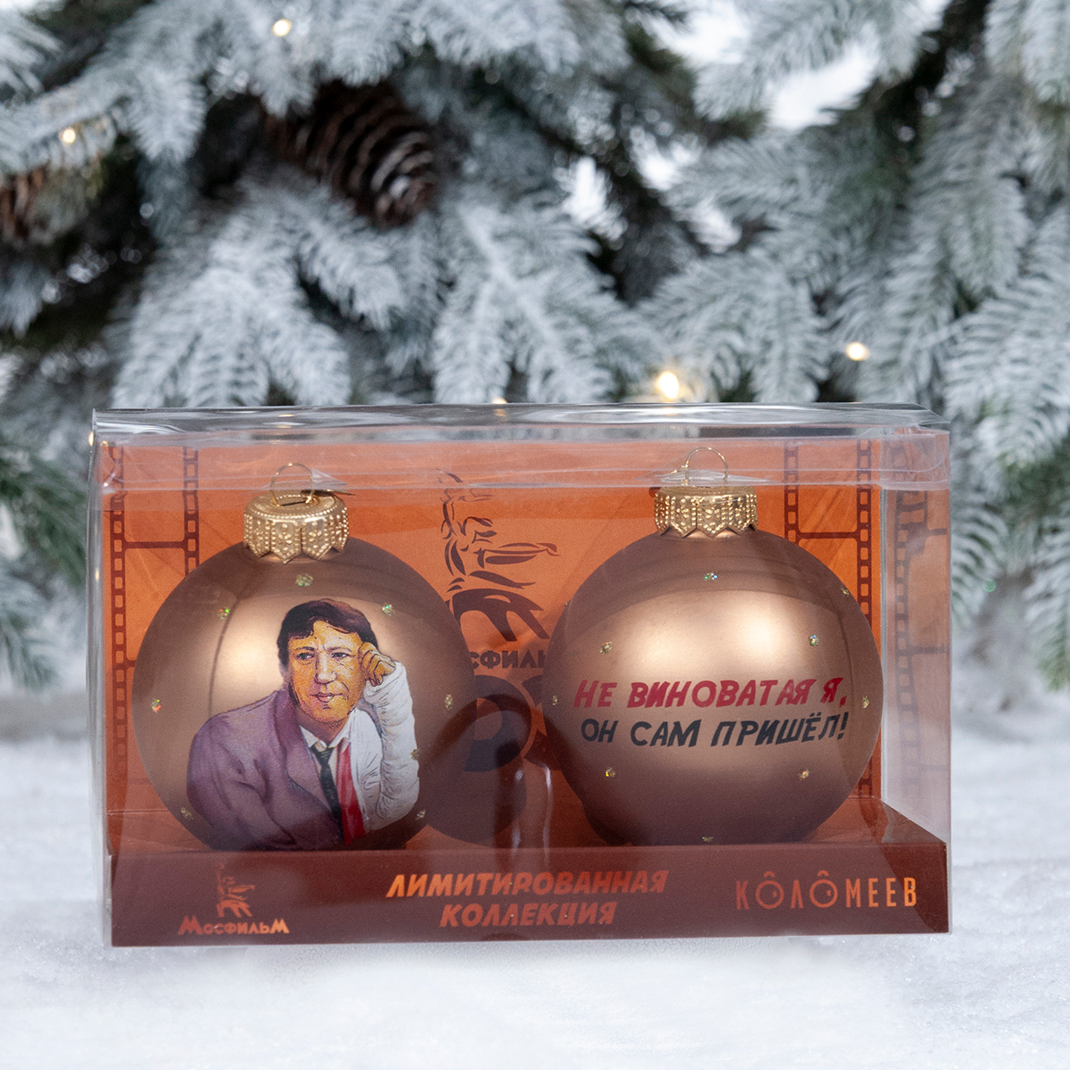 Набор ёлочных игрушек из стекла с изображением главного героя и крылатой фразы из легендарного фильма «Бриллиантовая рука», вошедшего в «Золотую коллекцию» МОСФИЛЬМА – уникальный сувенир для поклонников советского кинематографа.