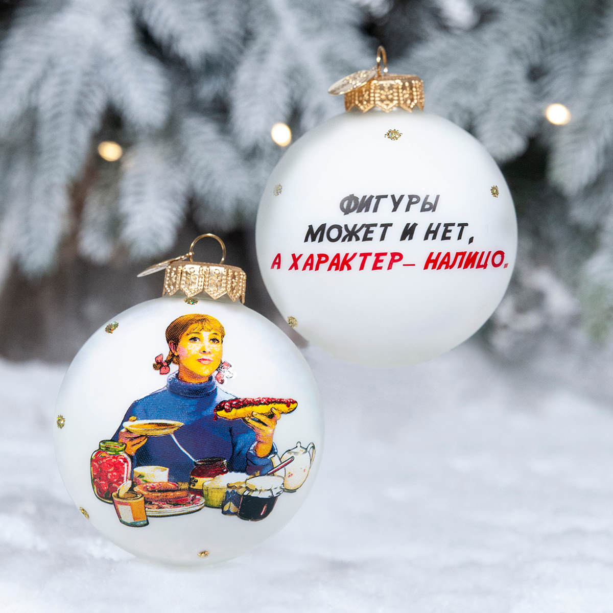 Набор ёлочных игрушек из стекла с изображением главной героини и крылатой фразы из легендарного фильма «Девчата», вошедшего в «Золотую коллекцию» МОСФИЛЬМА – уникальный сувенир для поклонников советского кинематографа.