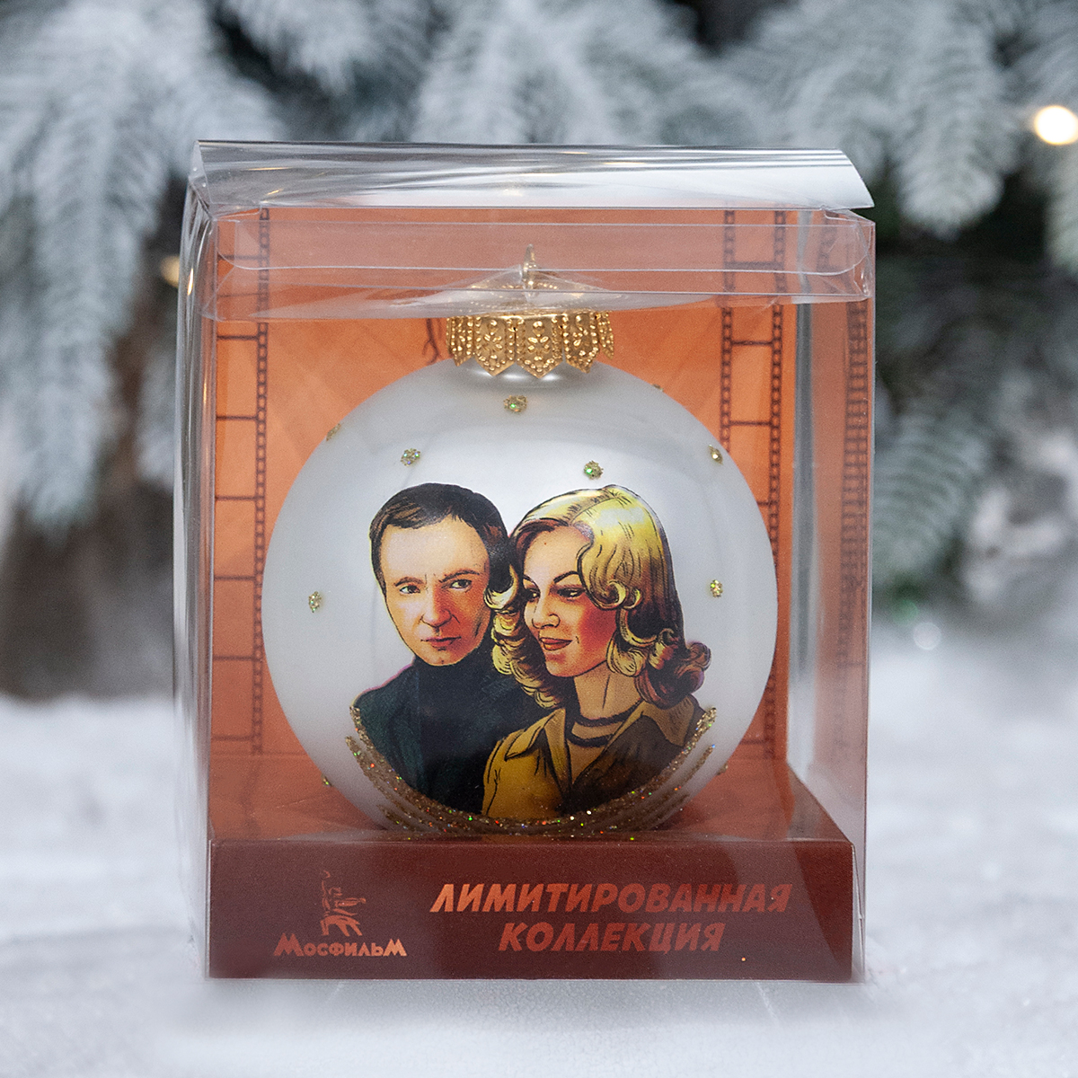 Ёлочная игрушка из стекла с изображением главных героев легендарного фильма «Ирония судьбы, или С легким паром!», вошедшего в «Золотую коллекцию» МОСФИЛЬМА – уникальный сувенир для поклонников советского кинематографа.