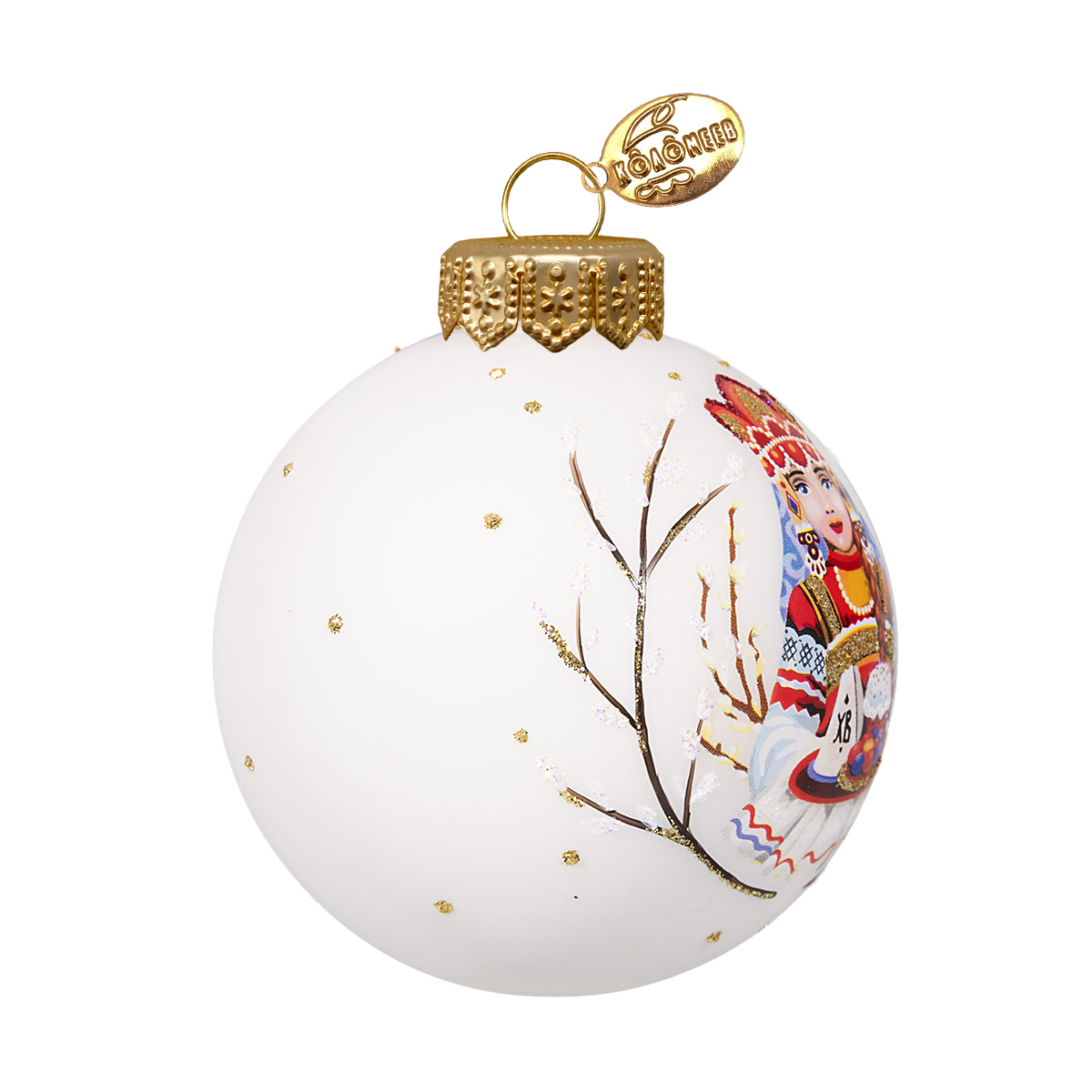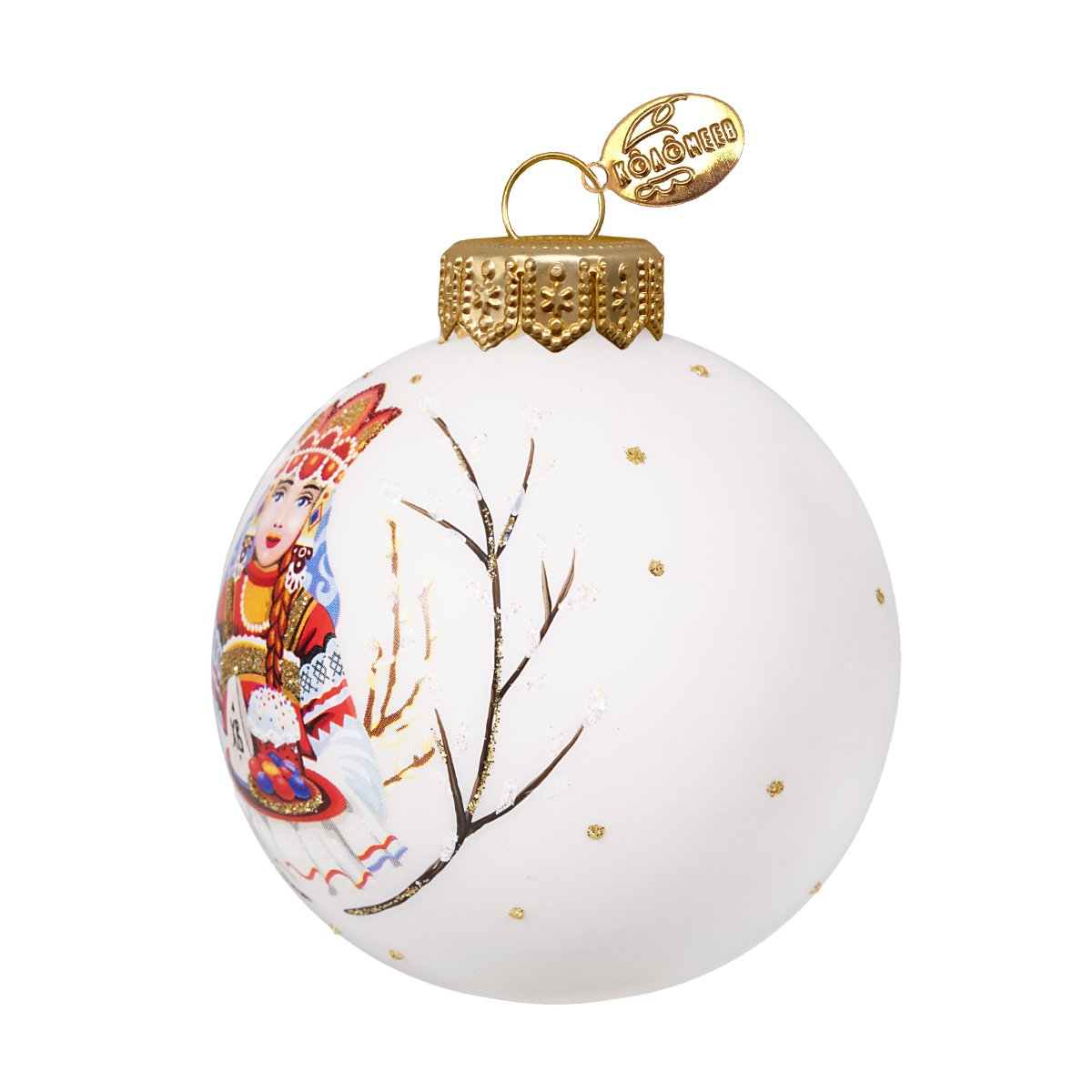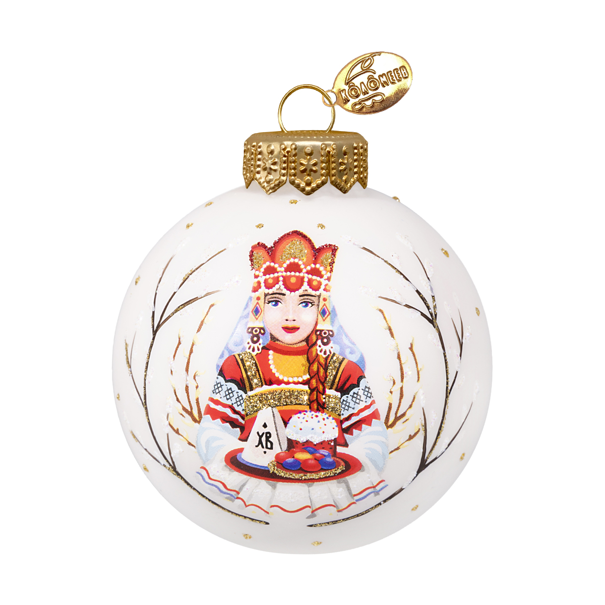 Нежный пасхальный шар — ручная работа бренда КОЛОМЕЕВ. Классический размер позволяет разглядеть каждую деталь сюжета: девочка в радостном настроении несёт кулич и крашеные яйца, передавая тепло светлого праздника.